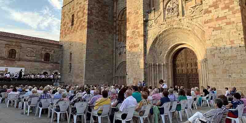 Desde la Plaza Mayor, la música se trasladaba al Atrio de la Catedral. Allí se había preparado un gran escenario sobre el que actuaron todos los músicos presentes, más de un centenar, primero dirigidos por Raquel Sánchez, y luego por Elisa Gómez, interpretar un hermoso concierto en el lugar, al que acudieron cerca de cuatrocientas personas, a una hora en la que el calor daba ya un respiro. Se encargaba de presentarlo Javier Bussons, trombón de la Banda de Música de Sigüenza.