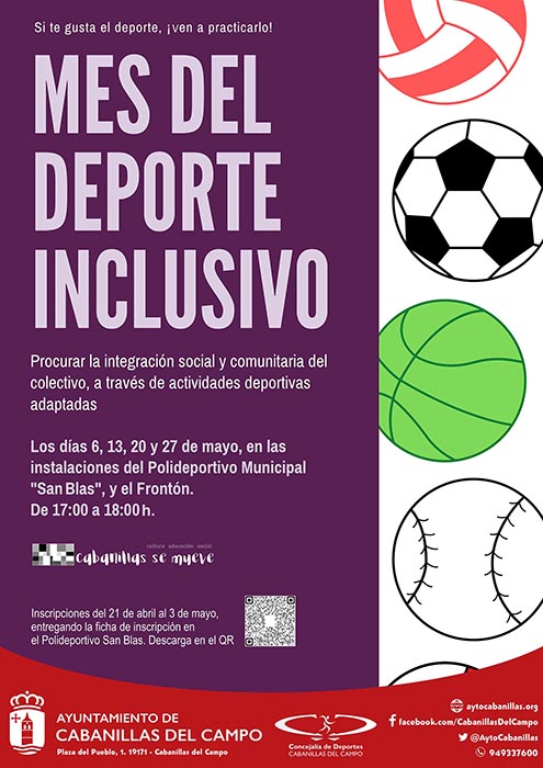 La Concejalía de Deportes del Ayuntamiento de Cabanillas del Campo organizará el próximo mayo un ciclo de sesiones de entrenamiento deportivo, orientado a personas con discapacidad. Se trata del «Mes del Deporte Inclusivo», que contará con la coordinación de los dos monitores deportivos especializados que han sido contratados recientemente por el consistorio a través del Plan de Empleo.