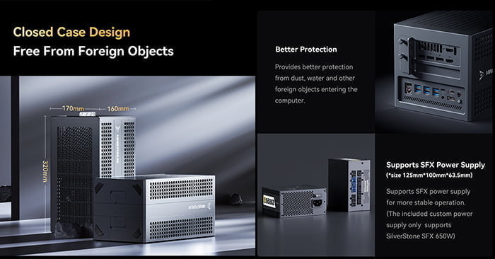Con la fuente de alimentación SFX integrada en la carcasa externa, el B550 PRO puede alimentarse con una sola fuente de alimentación, transformando la Mini PC en una computadora de escritorio para juegos de tamaño completo. Además, el dispositivo también viene con una opción de fuente de alimentación de CC independiente para mayor comodidad.