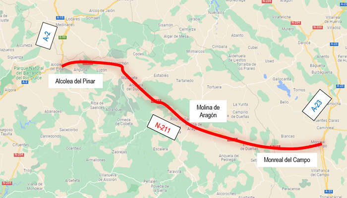 El Ministerio de Transportes, Movilidad y Agenda Urbana (Mitma) ha adjudicado un contrato de servicios para la redacción del estudio informativo: “Mejora del itinerario de la carretera N-211. Tramo: Alcolea del Pinar (A-2) -Monreal del Campo (A-23)”, en las provincias de Guadalajara y Teruel. El importe de adjudicación asciende a 554.054,15 euros.