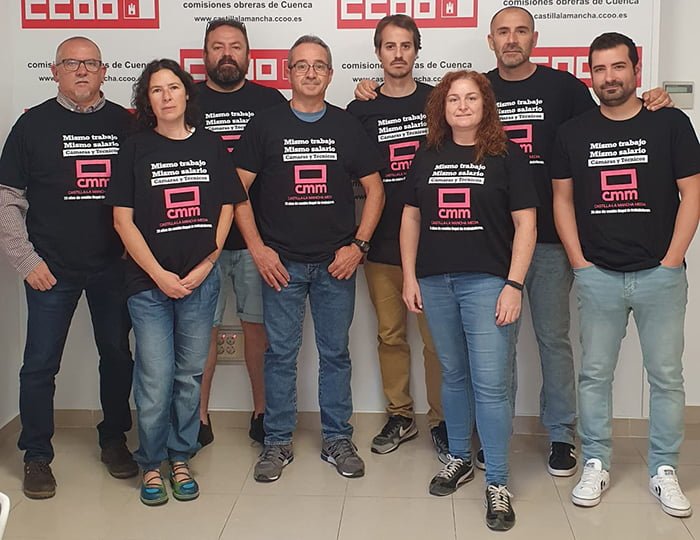 Concentraciones similares llevaron a cabo sus compañeros/as subcontratados en el resto de las delegaciones del ente público, todos y todas ellas vistiendo camisetas negras con el lema “Mismo trabajo, mismo salario” en letras blancas, el nombre de sus profesiones “cámaras y técnicos” y el logotipo de su empresa principal, el de Castilla-La Mancha Media. Comenzaron su movilización el miércoles pasado, coincidiendo con la celebración del Día Mundial de la Libertad de Prensa, y a partir de ahora, volverán a concentrarse y a lucir sus camisetas todos los miércoles, ‘miércoles negros’ que repetirán hasta conseguir que el Ente Público les reconozca sus derechos.