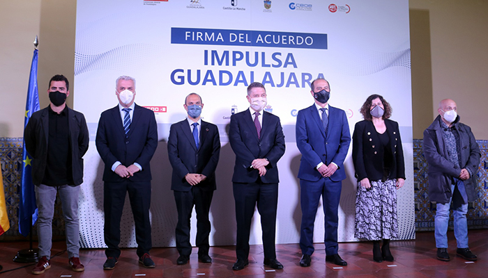El alcalde de Guadalajara, Alberto Rojo; el presidente de Castilla-La Mancha, Emiliano García-Page; el presidente de la Diputación, José Luis Vega; los secretarios de UGT y CC.OO., Paco Sánchez y Javier Morales; la presidenta de CEOE-CEPYME, María Soledad García, en presencia del presidente de las Cortes regionales, Pablo Bellido, han firmado el documento que incorpora, además, todos los objetivos del Plan de Recuperación, Transformación y Resilencia de la Economía española por la crisis de la covid19.
