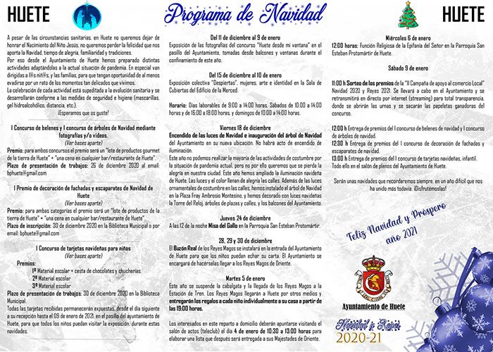 Este año no podemos realizar la mayoría de las actividades de costumbre por la situación de pandemia actual, pero no por ello queremos que se pierda la alegría en nuestra ciudad. Este año hemos ampliado la iluminación navideña de Huete. Las luces y el color llenan de alegría las calles. Además de las luces ornamentales de costumbre en las calles, hemos instalado el árbol de Navidad en la Plaza Fray Ambrosio Montesino, y hemos decorado con luces navideñas la Torre del Reloj, árboles de plazas y calles, y los balcones del Ayuntamiento.