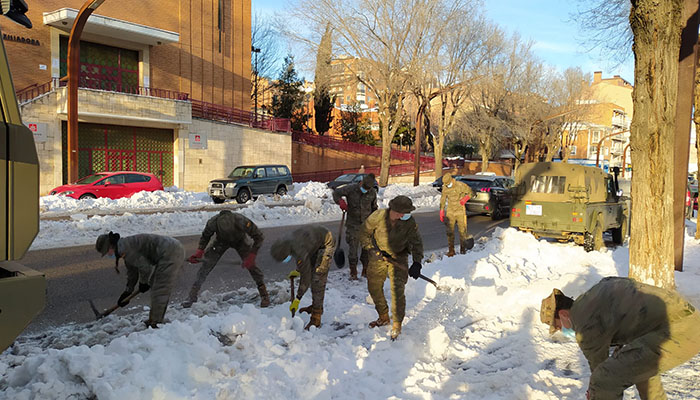 Alrededor de un centenar de militares se incorporan así al operativo de limpieza y retirada de nieve y hielo con el que el Ayuntamiento hace frente a los efectos del temporal ‘Filomena’, habiendo contado también con efectivos de la Diputación Provincial así como de la Junta de Comunidades de Castilla-La Mancha.