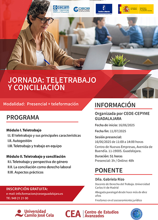 En esta ocasión la parte presencial contará con la jornada titulada “Teletrabajo y conciliación” el próximo lunes 16 de junio de 11:00 a 14:00 en el centro de nuevas empresas de Guadalajara y el resto del curso en la modalidad de teleformación, con una duración de 48 horas que se desarrollará hasta el 11 de julio.