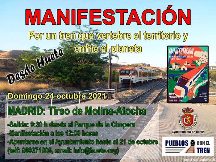 Para dar la mayor participación posible se organizará el desplazamiento a la manifestación de Madrid del domingo 24 de octubre en Autobús gratuito con salida a las 9:30 horas desde el Parque de la Chopera (se volverá por la tarde dejando tiempo libre). Para poder asistir habrá que inscribirse en el Ayuntamiento de Huete, por email: info@huete.org o por teléfono: 969371005.