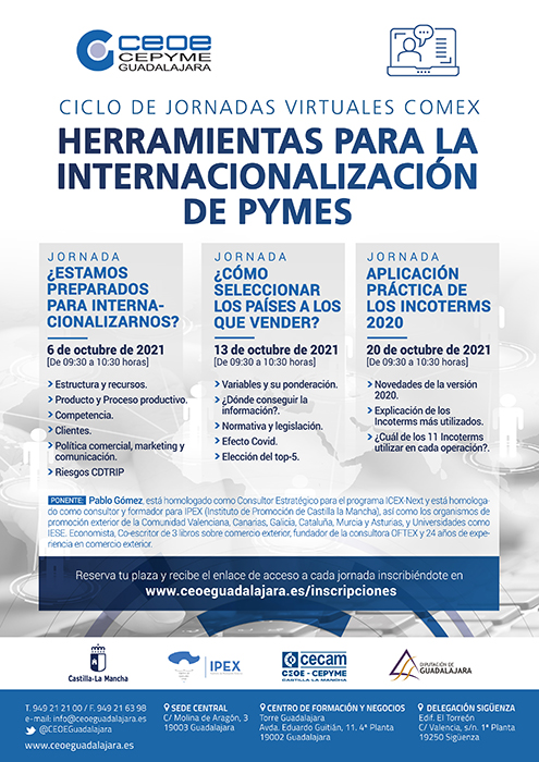 El departamento de Comercio Exterior de CEOE-CEPYME Guadalajara ha organizado un nuevo ciclo de jornadas que va a desarrollar a lo largo del mes de octubre, concretamente se desarrollarán tres sesiones, los días 6, 13 y 20 de octubre y, que se desarrollarán de manera virtual.