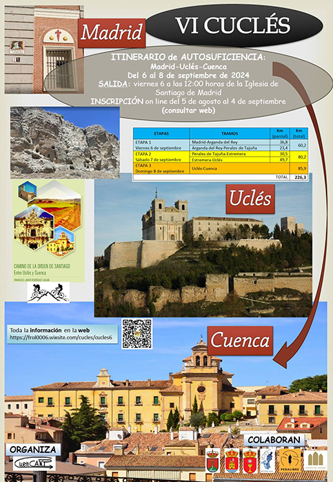 La CUCLÉS es el recorrido del Camino de la Orden de Santiago entre Uclés y Cuenca. Este 2024 celebramos la 6ª edición. Será entre el viernes 6 y el domingo 8 de septiembre.