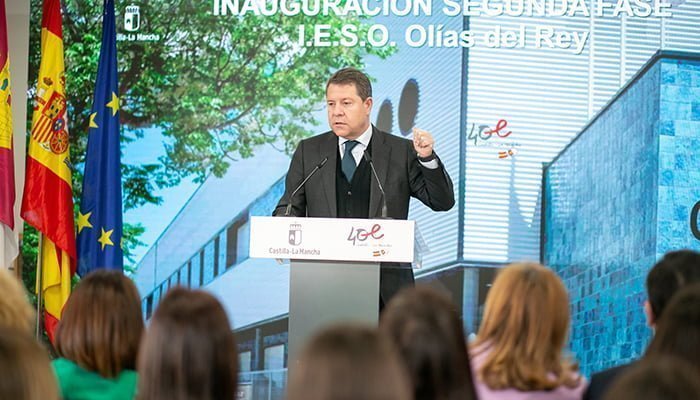 El presidente regional hacía estas declaraciones durante la inauguración de la segunda fase del IESO ‘Olías del Rey’ con la que se culmina la construcción del primer centro de estas características con el que cuenta la localidad toledana y en el que cursan sus estudios más de 300 alumnas y alumnos. “El centro es un prototipo, tanto el edificio como los docentes son modélicos”, ha subrayado, al tiempo que ha considerado “la educación” como “una prioridad para cualquiera que se la tome en serio”, ha concluido.