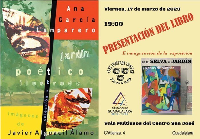 A partir de las 19:00 horas, con entrada libre hasta completar el aforo del local, se presentará el libro “Jardín poético ilustrado”, el nuevo poemario de la profesora y poeta guadalajareña Ana García Lamparero, ilustrado con 20 cuadros de Javier Alguacil Álamo, artista plástico y profesor también, que ha desarrollado su labor durante 15 años en el Instituto de Pastrana, y en la misma sesión se inaugurará la exposición “De la Selva al Jardín”, una retrospectiva del pintor que incluye varios de los cuadros que aparecen en el libro pero donde a la vez podremos comprobar la evolución de su estilo. Juan Carlos Pérez-Arévalo, editor de la obra y director de Colección TTT, hará la presentación de la sesión, que contará con la participación de ambos artistas.
