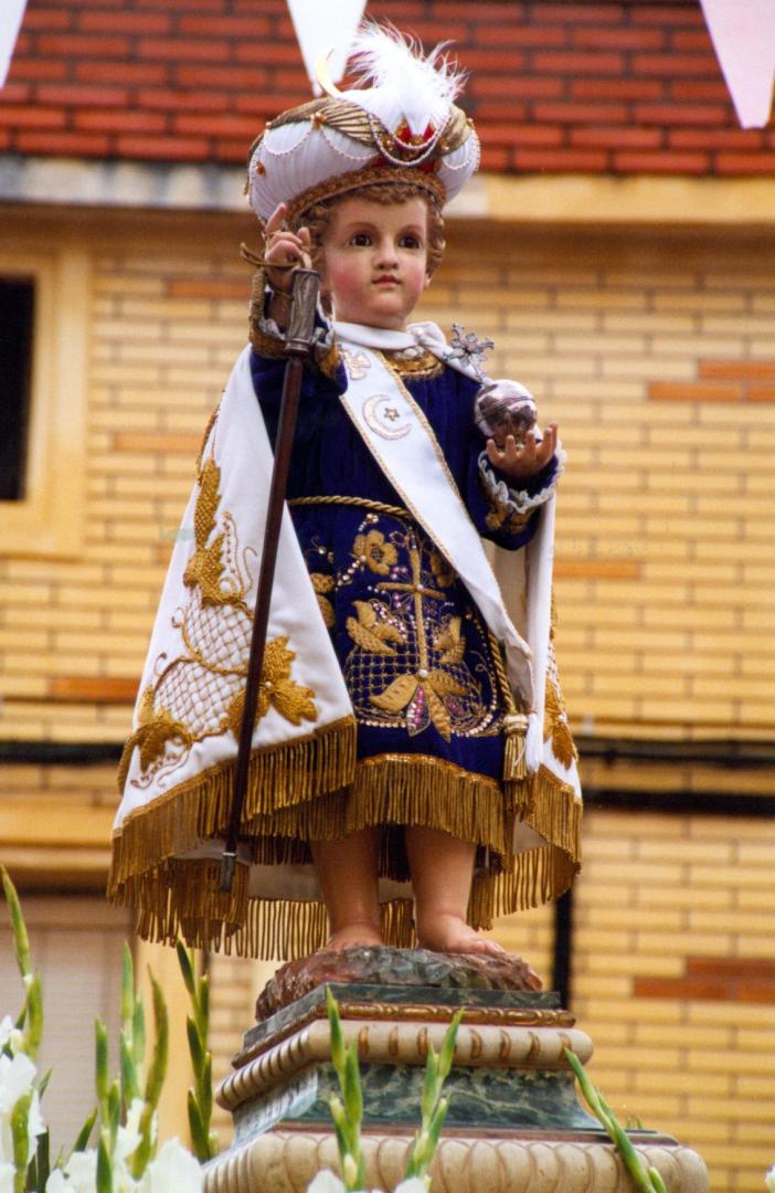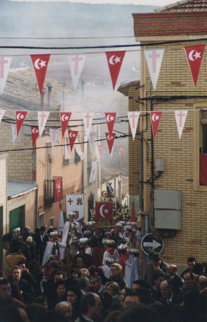 Y de nuevo el rumor de batalla toma cuerpo y se apodera de la Plaza, los sonidos de los trabucos se expanden hacia el cielo para advertir la victoria de la Cristiandad frente al africano. La procesión se reanuda, y ahora son las tropas cristianas las que llevan al Santo Niño, cambiado su gorrito.
