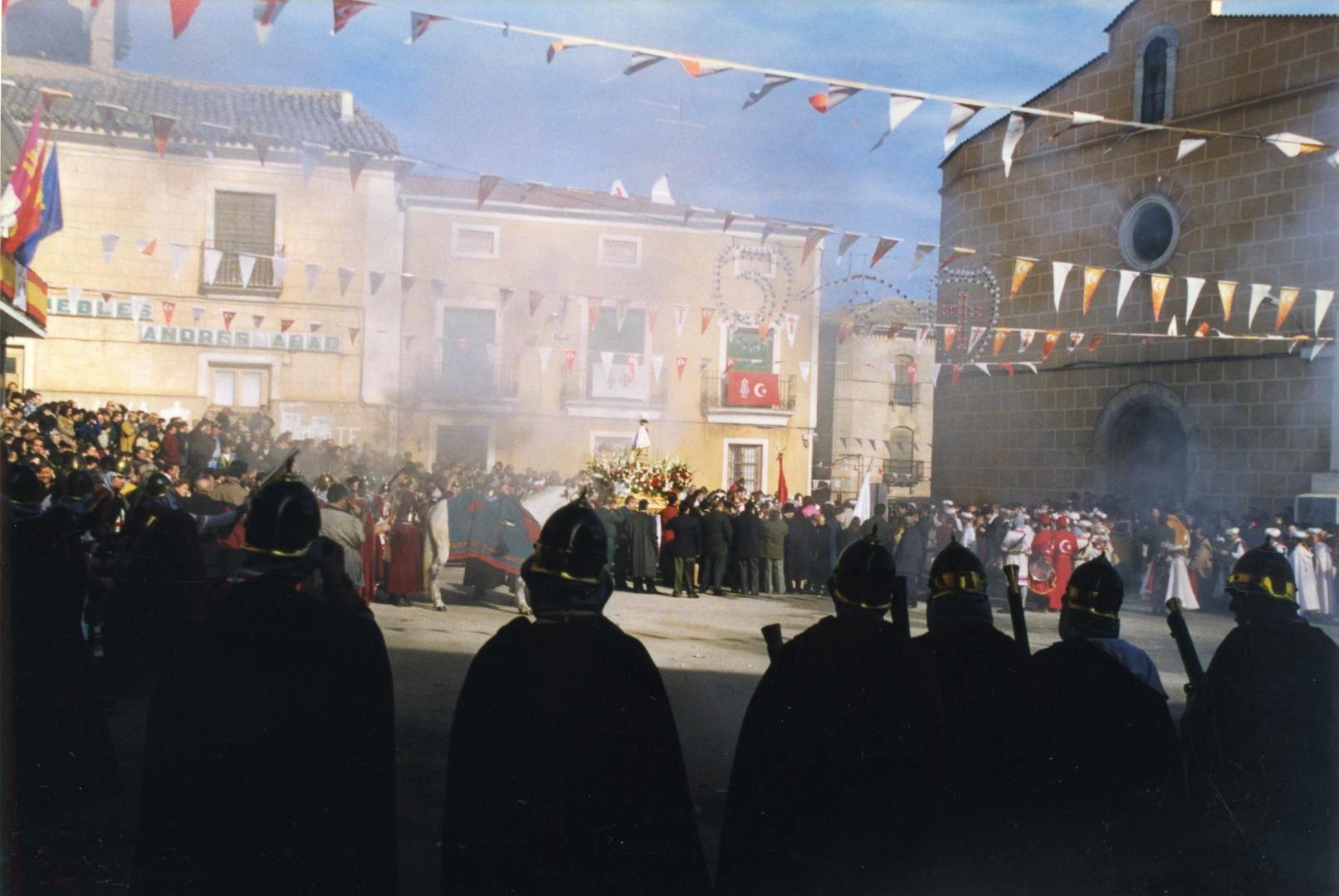 En la Plaza Mayor veo a la tropa mora con sus directivas al frente, saludando a los tempraneros ocupantes con una abundante salva de pólvora. Juan Carlos, el ‘dichero’, el general de los dichos, en caballo ricamente enjaezado. En las dependencias del Ayuntamiento espera y está presente el XIII Conde de Valverde, José Jerónimo Martel, y miembros de la corporación municipal local y alcaldes llegados desde la provincia.