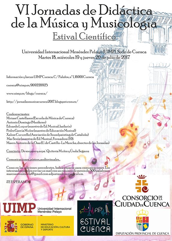 La sede de la Universidad Internacional Menéndez Pelayo (UIMP) de Cuenca albergará por sexto año consecutivo una nueva edición de las Jornadas de Didáctica de la Música y Musicología. Dirigidas por el maestro en Educación Musical, musicólogo y profesor asociado de la Facultad de Educación de la Universidad de Castilla-La Mancha Marco A. de la Ossa, ocupan el espacio dedicado a la investigación y pedagogía en Estival Cuenca, el festival musical y artístico que también cumplirá su sexta edición en 2017, dentro del apartado Estival Científico. De esta forma, se llevarán a cabo entre el martes 18 y el jueves 20 de julio.