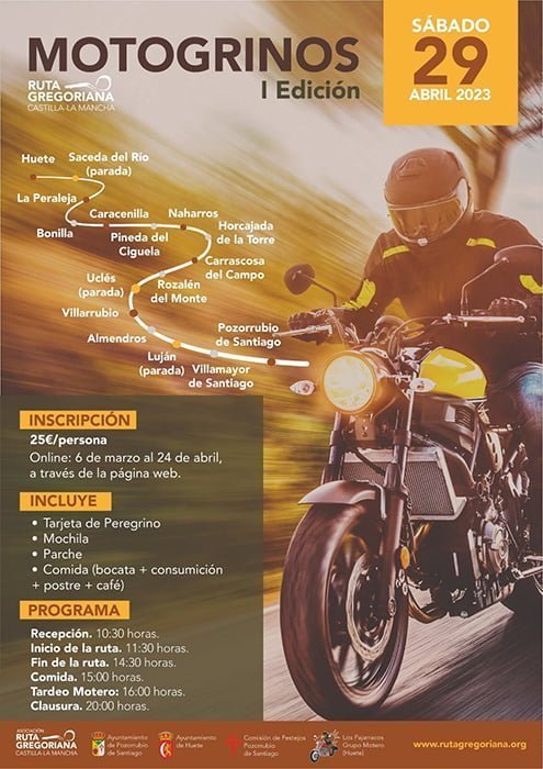 Primera edición de la Ruta Gregoriana en Moto desde HueteEl próximo sábado 29 de abril la Asociación Ruta Gregoriana de Castilla la Mancha organiza, con la colaboración del Ayuntamiento de Huete, la primera edición de MOTOGRINOS, que consiste en realizar un tramo de la Ruta Gregoriana en moto de forma organizada.