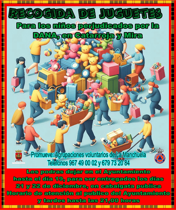 La agrupación local de Protección Civil, en colaboración con otras agrupaciones de voluntarios de La Manchuela y el Ayuntamiento de Iniesta recogerán juguetes para los niños y niñas afectados por la DANA en Mira y Catarroja
