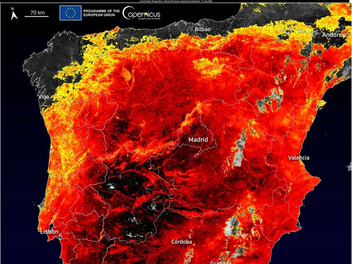 Hoy lunes se esperan que las temperaturas máximas continúen en ascenso, salvo en el interior del cuadrante noroccidental peninsular y Galicia, que será más acusado en el área mediterránea y extremo suroccidental peninsular. Por lo tanto, continuarán alcanzándose los 37-39ºC de forma generalizada en el interior peninsular, extendiéndose también a las cuencas del Júcar y el Segura y al interior del País Vasco, donde incluso se podrían superar localmente los 40ºC. Se espera superar también este valor en los valles fluviales del cuadrante suroccidental, incluso los 42ºC en el Guadalquivir, que también podrían alcanzarse en puntos del valle del Ebro y depresiones del nordeste, donde esta jornada sería la más calurosa del episodio.