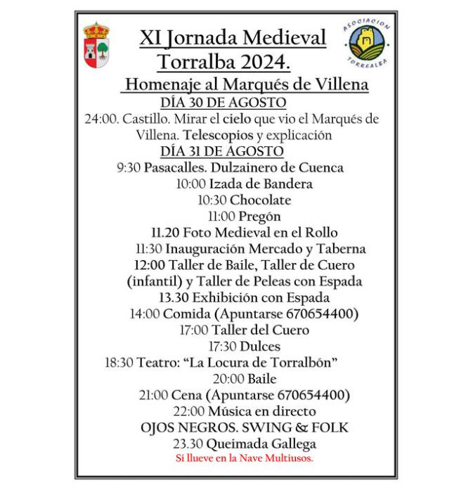 A las once y media comienza el mercado, los talleres y las exhibiciones con espada para pasar, por la tarde, al taller de cuero, dulces y la obra “La locura de Torralbón”. La noche finalizará con una queimada gallega y la música de Ojos Negros Swing & Folk.