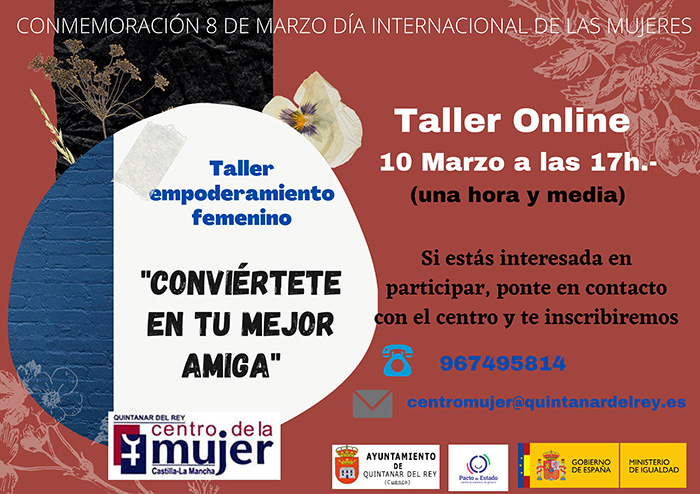 El taller ‘Conviértete en tu mejor amiga’ se realizará el miércoles día 10 de marzo, a las 17.00 horas, y tiene una duración de hora y media. Para participar es necesario inscribirse en el Centro de la Mujer de Quintanar del Rey a través del teléfono 967 495 814 o del email centromujer@quintanardelrey.es