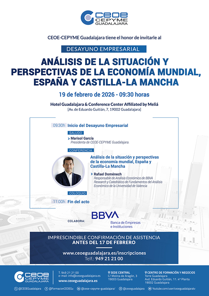Bajo el título “Análisis de la situación y perspectivas de la economía mundial, España y Castilla-La Mancha”, Rafael Doménech, responsable de Análisis Económico de BBVA, además de research y Catedrático de Fundamentos del análisis económico de la Universidad de Valencia, será el protagonista de un nuevo desayuno empresarial organizado por CEOE-CEPYME Guadalajara en colaboración con BBVA, que tendrá lugar el próximo jueves 19 de febrero de 9:30 a 11:00 horas en el hotel Guadalajara & Conference Center Affiliated by Meliá.