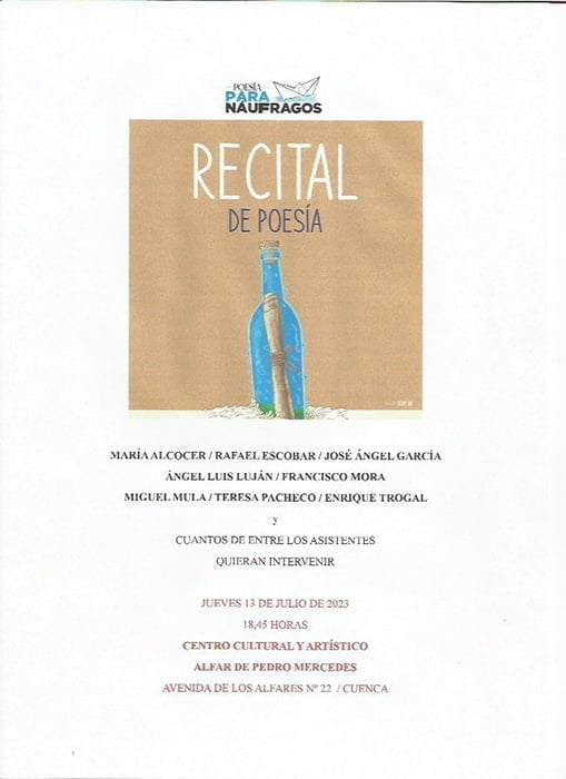 El remodelado jardín del Centro Cultural y Artístico ubicado en el antiguo Alfar de Pedro Mercedes en el barrio de San Antón prestará espléndido marco este jueves 13 de julio a un recital colectivo al aire libre organizado por la Asociación Cultural Poesía para Náufragos, propiciadora del Festival que desde hace ya diez años convierte cada noviembre a Cuenca en lugar de encuentro de la poesía contemporánea de nuestro país. El Alfar, hogar y lugar de trabajo del que fuera uno de los creadores más icónicos de la plástica conquense, hoy gestionado por el Colectivo Lamosa (Laboratorio Modulable Artístico), da así un paso más en su declarado objetivo de convertirse, además de en propuesta museística expositiva, en contenedor y plataforma de dinamización, creación y muestra de contenidos relacionados con la cultura y el arte. El recital se iniciará a las siete menos cuarto y de la tarde, con entrada libre y gratuita, y contará con intervenciones de algunos de los integrantes del colectivo literario convocante tales como María Alcocer, Rafael Escobar, José Ángel García, Ángel Luis Luján, Francisco Mora, Miguel Mula, Teresa Pacheco o Enrique Trogal y se invitará asimismo a intervenir a quienes de entre los asistentes a la cita quieran hacerlo.