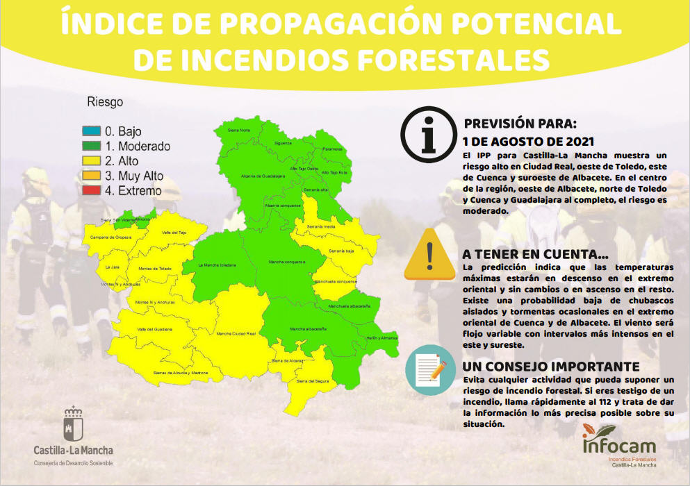 Para hoy, el Índice de Propagación Potencia de Incendios Forestales (IPP) para Castilla-La Mancha, muestra un riesgo alto en Ciudad Real, oeste de Toledo, este de Cuenca y suroeste de Albacete. En el centro de la región, oeste de Albacete, norte de Toledo y Cuenca y Guadalajara al completo, el riesgo es moderado.
