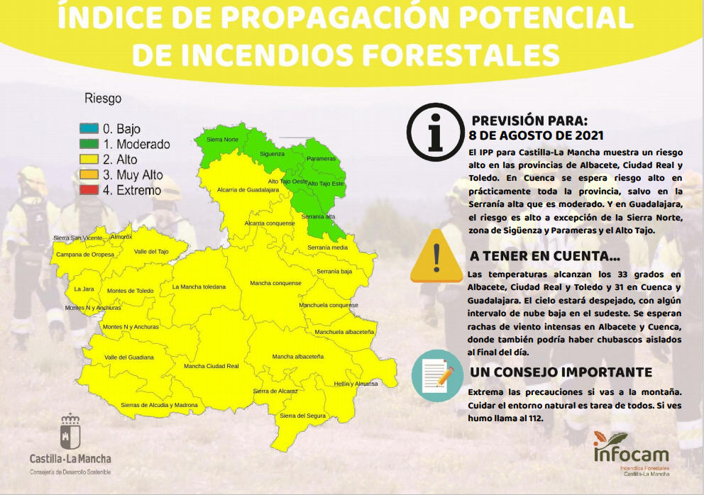 El IPP para Castilla-La Mancha muestra un riesgo alto en las provincias de Albacete, Ciudad Real y Toledo. En Cuenca se espera riesgo alto en prácticamente toda la provincia, salvo en la Serranía alta que es moderado. Y en Guadalajara, el riesgo es alto a excepción de la Sierra Norte, zona de Sigüenza y Parameras y el Alto Tajo.