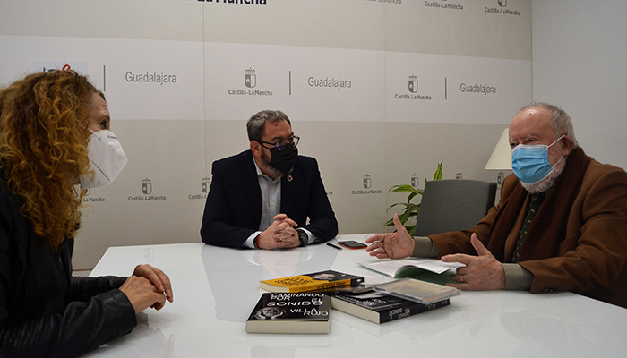El delegado de la Junta en Guadalajara, Eusebio Robles, junto a la delegada provincial de Hacienda y Administraciones Públicas, Pilar Cuevas, ha mantenido una reunión con el director y compositor briocense Jesús Villa-Rojo para conocer de primera mano los proyectos en los que el músico se encuentra actualmente trabajando.