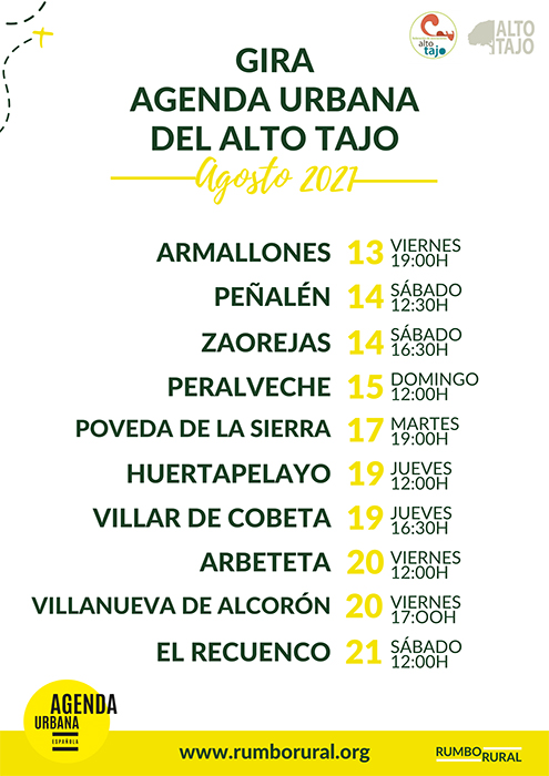 *Las fechas y horarios de la “Gira Agenda Urbana del Alto Tajo” han sido consensuados con cada pueblo. Días antes de cada visita se anunciará a través de las redes sociales de RumboRural el lugar específico en el que se recibirá a los vecinos.