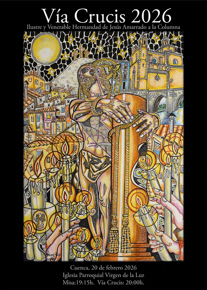Sobre el Cartel del Vía Crucis, en cuyo primer plano podemos contemplar la imagen realista de Nuestro Padre Jesús Amarrado a la Columna, Bux explica que “lo he querido destacar como imagen principal”. El ‘Amarrao’ aparece “arropado a su izquierda por casas bajas, estrechas y reducidas, típicas del barrio del Perchel con las que puedes tocar los tejados”. A la derecha de la talla “nuestra parroquia de la Virgen de la Luz, que se divisa al fondo con el puente de San Antón y su río Júcar”. El momento temporal en el que se celebra el Vía Crucis, la noche del primer viernes de Cuaresma, “tiene su representación con un cielo negro, salpicado de estrellas, rompiéndose porque ya está flagelado”, detalla Bux.