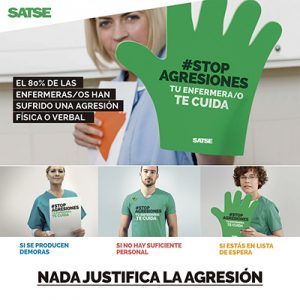 SATSE lanzó el pasado mes de marzo la campaña “#StopAgresiones. Nada justifica una agresión”, con el objetivo de seguir informando y sensibilizando sobre este problema tanto a ciudadanos y profesionales como a administraciones públicas y empresas sanitarias privadas. Asimismo, ha solicitado a la nueva ministra de Sanidad, Carmen Montón, que promueva una ley nacional que coordine las actuaciones necesarias para acabar con las agresiones a los profesionales.