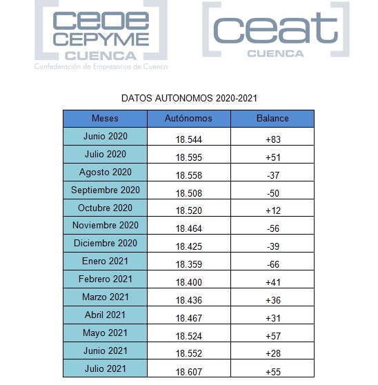 CEAT Cuenca reseña que los datos de la Seguridad Social indican un crecimiento ininterrumpido de autónomos desde el mes de febrero, un elemento sin duda positivo por lo que suponen para una economía con escaso tejido productivo como la de Cuenca.