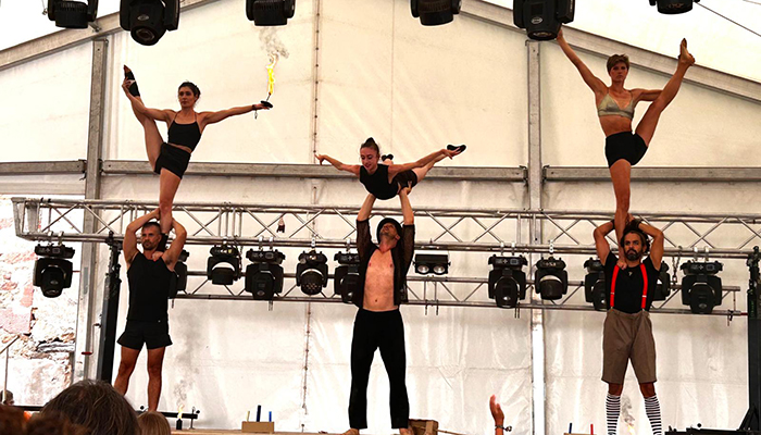 Por la tarde tuvo lugar en el trinquete la actuación de la formación Fire Flow Team, de Barcelona, compuesta por tres chicos y tres chicas que captaron la atención del público con un número que combinaba humor, gimnasia rítmica, acrobática y vertical. Y todo ello, además, con el aliciente de que varios de los números se ejecutaron con fuego. Ana López, una de las acróbatas es, además, miembro de la comisión de fiestas de Setiles. “Otros años se había programado para esta franja horaria una obra de teatro y parece que no acababa de cuajar”, explica. “Queríamos una actuación diferente, que fuera para todos los públicos, y como las personas que integran la comisión sabían que me dedico a esto, me propusieron organizar algo, y me puse en contacto con varios compañeros”. Otra de las integrantes del espectáculo, Giulia Caccin señala que han preparado el número en poco más de un mes. “Queríamos algo que encajara en el contexto de unas fiestas, que fuera divertido, que conectara con el público”. Ha sido un mes de duro trabajo para conseguir este montaje que ayer estrenaron en Setiles, un espectáculo de casi una hora de duración que dejó al público boquiabierto con su exhibición de fuerza, equilibrio y flexibilidad corporal.