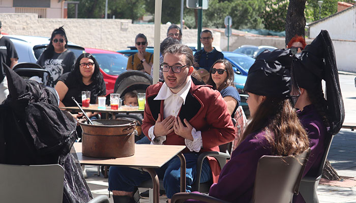 Así, al tiempo que los bares despachaban estas magníficas creaciones culinarias (que iban desde huevos con codorniz hasta migas manchegas, pasando por queso cremoso con cebolla, brazos de pulpito o carrilleras de cerdo), los chicos y chicas de la Escuela de Teatro recorrían los bares y sus terrazas. En concreto visitaron el Bar Queen’s, el Bar El Patio, el Bar Liberty, Tarambana Cátering, Cámara Café, el Bar Donde Arturo y la Cervecería El Paso. Y en todos ellos representaron unas pequeñas obras de creación propia, en la que personajes salidos de grandes obras del teatro universal (de obras de autores como Lorca, Buero Vallejo, Shakespeare, Rostand, Goethe o Ibsen) escapaban de sus libros para tomarse un descanso y una caña, al tiempo que disertaban entre ellos sobre sus tribulaciones.