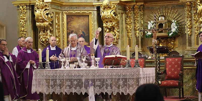 A partir de las once y media de la mañana, en la iglesia del Monasterio, tenía lugar una eucaristía que celebró el obispo de la diócesis de Sigüenza-Guadalajara, Atilano Rodriguez, en presencia del obispo emérito, José Sánchez. Acudieron decenas de sacerdotes, buena parte de ellos ejercen su labor en la provincia de Guadalajara y muchos de ellos han colaborado con ellas en su labor educativa y espiritual, además de otros invitados, seguntinos y seguntinas que quisieron acompañar a la congregación en este momento tan especial, los familiares de las religiosas y destacadas personalidades locales, provinciales, regionales y nacionales y los trabajadores y trabajadoras del centro. El público llenó por completo el templo para participar del momento y agradecer su labor a las Ursulinas.