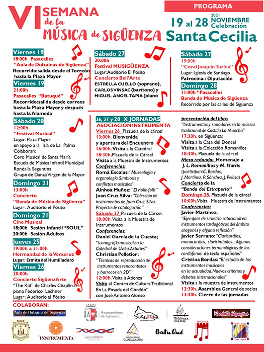 Pasacalles, conciertos, conferencias o muestras de instrumentos son algunas de las actividades que el Ayuntamiento de Sigüenza y la Cofradía de Santa Cecilia, en colaboración con asociaciones y colectivos relacionados de alguna manera con la música en la ciudad, proponen para celebrar de la festividad de Santa Cecilia.