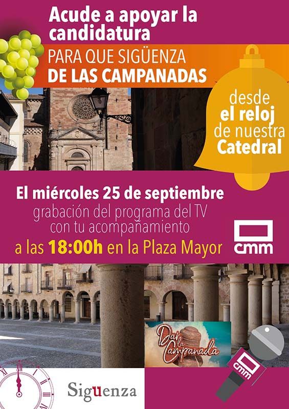 Para decidir los finalistas, en estos días, CMMedia está grabando un programa en cada una de las localidades clasificadas. En Sigüenza lo hará el próximo miércoles, día 25 de septiembre. Para seguir compitiendo con todas las posibilidades de ganar, y dar así la campanada, el Ayuntamiento solicita la colaboración ciudadana.  Se trata, en resumen, de convertir el 25 de septiembre en el 25 de diciembre.