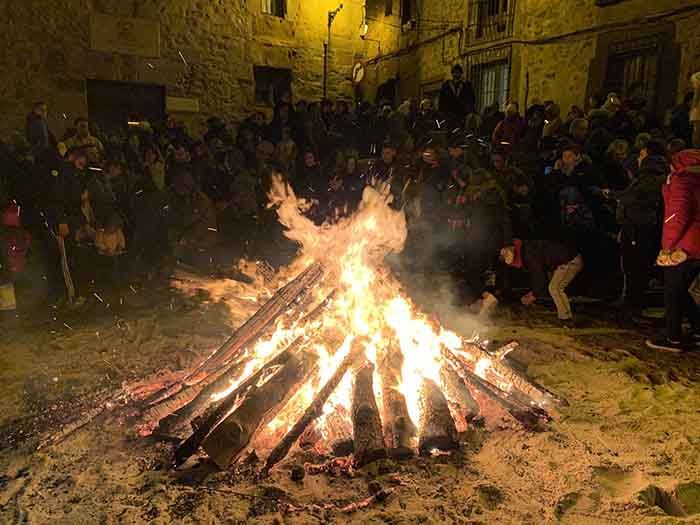 A esa hora, pasadas las siete de la tarde, el día ya era noche, y la luna, casi llena, iluminaba el cielo limpio, de helada. Cero grados, y bajando. De ser otra noche, la Travesaña Alta hubiera empezado a crujir bajo los pies, pero eran cientos los seguntinos que seguían a párroco y cofrades, y les esperaban en la Plazuela de San Vicnete, junto a la Casa del Doncel, para presenciar cómo se encendía la hoguera. Brevemente, Montejano roció, como había hecho antes con las rosquillas de agua bendita la pira de madera. VER MOMENTO. En su centro, un pino, con sus correspondientes naranjas y mandarinas colgando. El que fuera alcalde de Sigüenza, Juan Carlos García, dice que ese toque dulce y naranja según unos, hace alusión al lugar donde el santo fue martirizado, Valencia, mientras que, según otros, su presencia se debe a que siempre fue costumbre en el “bibitoque” del día 23, entregárselas a los niños, en una época en la comerlas era poco menos que un lujo.