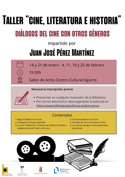 La Biblioteca Municipal de Cuenca organiza el taller «Cine, Literatura» e Histoiraen enero y febrero del presente año 2025. Lo impartirá Juan José Pérez Martínez, docente, director de cortemetrajes y miembro de la junta directiva del Cine Club Chaplin con amplia experiencia en el tema.