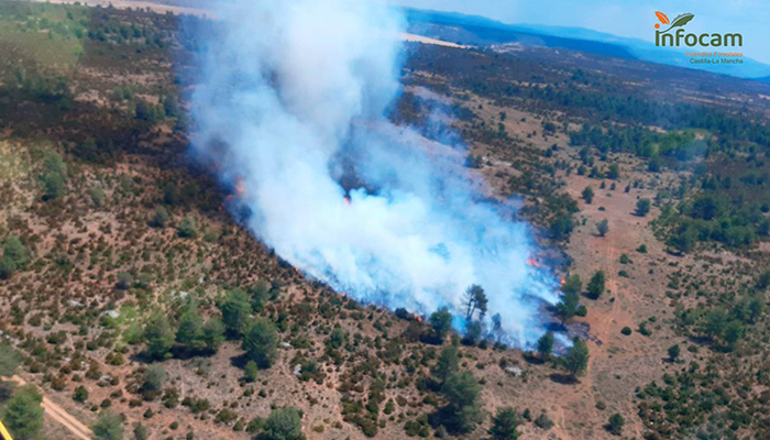 El incendio ha sido detectado a las 13:30 horas y afecta a una superficie de bosque compuesto por 50% Pinus nigra (Fustal), 40% Juniperus communis (Fustal).