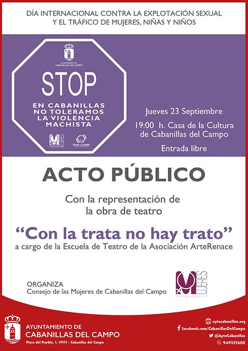 El Consejo de las Mujeres de Cabanillas del Campo ha organizado para este jueves 23 de septiembre un acto público con el que conmemorar el Día Internacional contra la Explotacion Sexual y el Tráfico de Mujeres, Niñas y Niños. El evento tendrá lugar en la Casa de la Cultura de Cabanillas, desde las 19 horas, con entrada libre hasta completar el aforo estipulado. En él, además de la intervención de la presidenta del Consejo, el acto central será la representación de una obra creada para la ocasión por la Escuela de Teatro de Cabanillas, dependiente de la Asociación ArteRenace, con el título «Con la trata, no hay trato».
