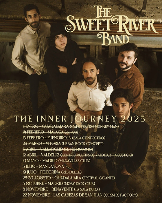Después de presentar por todo lo alto el pasado mes de octubre en la sala Clamores de Madrid su primer disco, los chicos de The Sweet River Band no paran de dar alegrías a su cada vez más numerosa masa social. Como no podía ser de otra manera, un gran disco merece una gran gira para ser presentado por el máximo de lugares posibles. Y eso es justamente lo que ha hecho la banda. The Inner Journey Tour 2025 afronta una de sus citas más importante durante el mes de agosto, fecha en la que estarán en Festival Gigante de Guadalajara. Sin duda una fecha cargada de emotividad y de responsabilidad, ya que jugar en casa y en un escenario como el del Gigante siempre hace que tengas que ir a un nivel superior de entrega. La fecha para este super evento será el 29 de agosto ocasión en la que la banda seguirán presentando las canciones que componen su disco ¨The Inner Journey¨.
