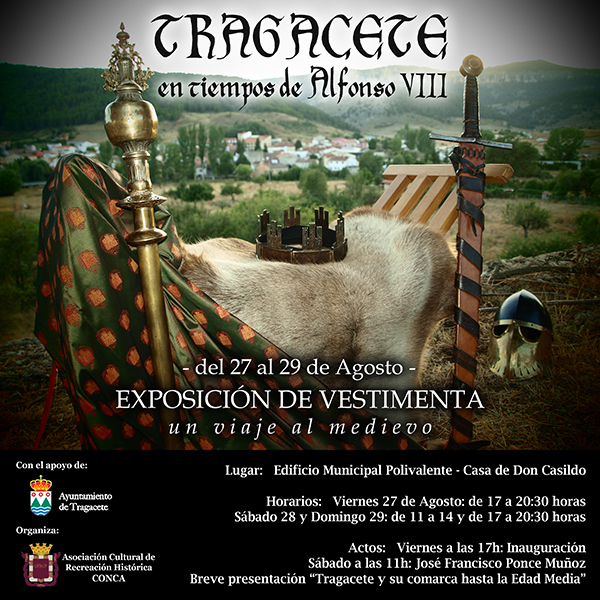 Organizada por la Asociación Medieval CONCA y en colaboración con el Ayuntamiento de Tragacete el público podrá contemplar réplicas de vestimentas, armas y utensilios de personajes que dejaron su impronta en el siglo XIII en la Serranía Conquense tales como pastores, campesinos, damas, guerreros, nobles, religiosos y hasta de los mismos reyes castellanos Alfonso y Leonor.La exposición podrá visitarse en el Edificio Municipal Polivalente de Tragacete ‘Casa de don Casildo’ el viernes 27 de agosto de 17,00 (inauguración) a 20,30 horas y el sábado y domingo de 11,00 a 14,00 y de 17,00 a 20,30 horas.