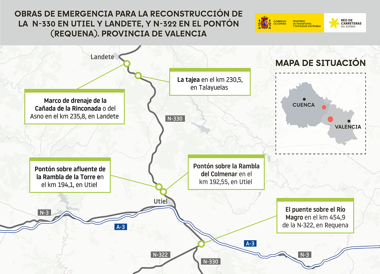 Estas dos vías se vieron afectadas por las crecidas del caudal del río Magro, en Requena, de un afluente de la Rambla de la Torre, en Utiel, y de la Cañada de la Rinconada o del Asno, en Landete, que causaron diversos daños en las carreteras N-322 y N-330 al paso sobre estos cauces. Las actuaciones han sido las siguientes: