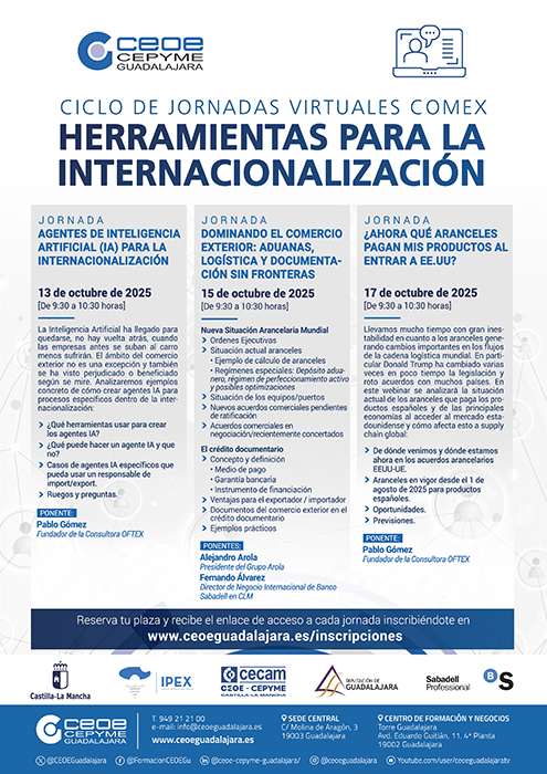 La última de las jornadas de este ciclo virtual de comercio exterior organizado por el departamento de Comercio Exterior de CEOE-CEPYME Guadalajara tendrá lugar el 17 de octubre con una ponencia titulada “Ahora qué aranceles pagan mis productos al entrar a EEUU”, donde se verá de dónde venimos y dónde estamos ahora en los acuerdos arancelarios EEUU-UE. Así se analizará la situación actual de los aranceles que paga los productos españoles y de las principales economías al acceder al mercado estadounidense y cómo afecta esto a supply chain global y se verán las oportunidades y previsiones.