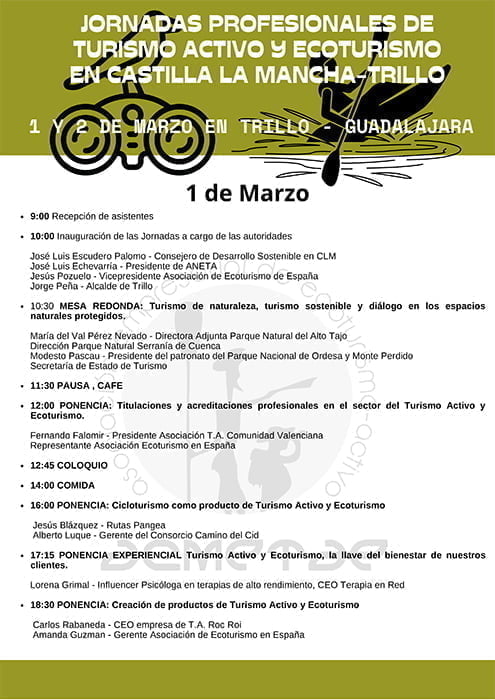 Las jornadas arrancarán a las 10.00 horas del miércoles 1 de marzo, con el acto de inauguración que presidirán el consejero de Desarrollo Sostenible de la Junta de Comunidades de Castilla-La Mancha, José Luis Escudero, el presidente de la Asociación Nacional de Empresas de Turismo Activo (Aneta), José Luis Echeverría, el vicepresidente de la Asociación de Ecoturismo de España, Jesús Pozuelo, y el alcalde de Trillo, Jorge Peña.