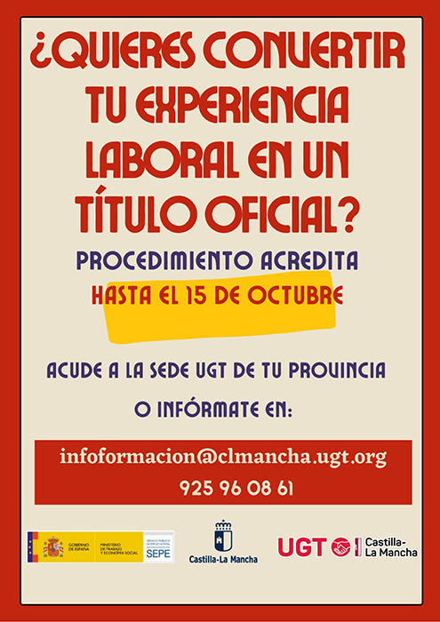 El plazo de presentación de solicitudes estará abierto hasta el 15 de octubre. Desde las sedes de UGT Cuenca, UGT Albacete, UGT Tomelloso, UGT Guadalajara o UGT CLM se llevará a cabo un asesoramiento para conseguir dicho fin. Los/as interesados/as en convertir su experiencia laboral en un título oficial pueden contactar con UGT CLM mediante correo electrónico (infoinformacion@clmancha.ugt.org) o llamando al 92596086, número de teléfono del departamento de formación del sindicato.