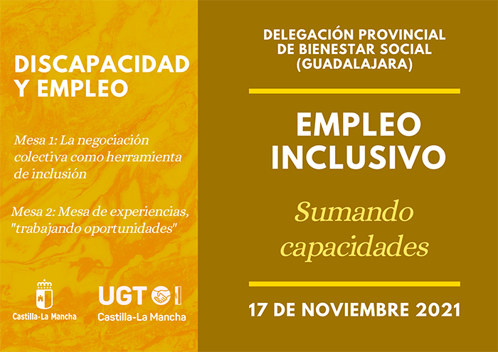 Con el título “Empleo inclusivo. Sumando capacidades”, las personas con discapacidad centrarán la jornada que UGT Castilla-La Mancha celebra el miércoles 17 de noviembre en Guadalajara. En ella –y a través de dos mesas de debate- los ponentes analizarán las oportunidades laborales de las personas con discapacidad así como las posibilidades de inclusión que ofrece la negociación colectiva.