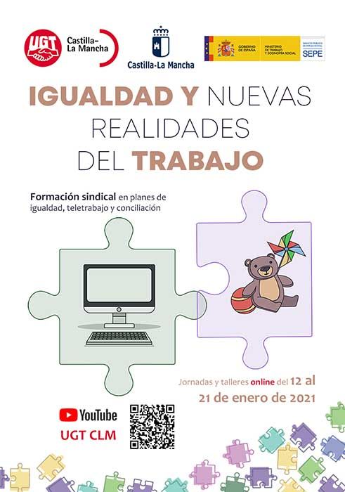 UGT CLM presenta el ciclo de jornadas, talleres y cursos “Igualdad y Nuevas Realidades del Trabajo” dirigidos a formar a los trabajadores y trabajadoras de la región en materia de igualdad y de nuevas realidades del trabajo, como el teletrabajo, para mejorar las condiciones laborales de las personas trabajadoras desde el diálogo social y la negociación colectiva. Las actividades se realizarán entre el 12 y el 21 de enero de 2021, tendrán un carácter práctico y participativo y se retransmitirán en directo a través del canal de YouTube de UGT CLM, plataforma en la que los interesados podrán plantear sus preguntas a través del chat en vivo.