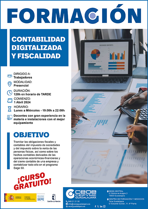 El departamento de Formación de CEOE-CEPYME Guadalajara informa de las últimas plazas para el curso de “Contabilidad Digitalizada y fiscalidad”, dirigido a trabajadores y que dará comienzo el próximo lunes 1 de abril.