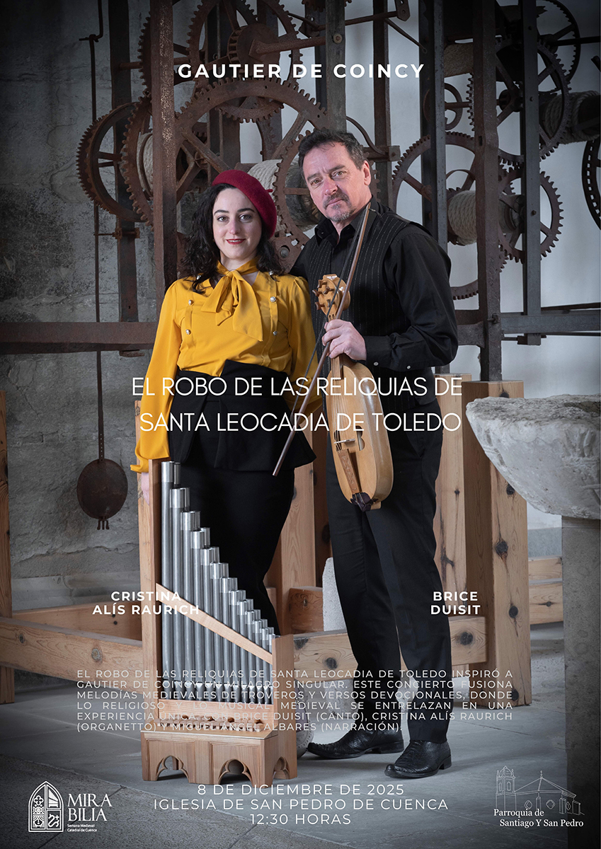El próximo lunes, 8 de diciembre a las 12:30 horas, la Iglesia de San Pedro de Cuenca acogerá el concierto: Gautier de Coincy: el robo de las reliquias de Santa Leocadia. Concierto que revive con la música, el canto y la palabra, la intriga, la fe y la emoción de un episodio medieval, donde lo sagrado y lo profano se entrelazan. Un robo en pleno corazón de Francia. Las reliquias de Santa Leocadia desaparecen y un milagro inesperado se revela. Gautier de Coincy convierte aquel misterio medieval en el único milagro de sus Miracles de Nostre Dame donde él mismo se convierte en protagonista. Una oportunidad única de escuchar en Cuenca uno de los mayores especialistas en música medieval, Brice Duisit, junto a la organettista Cristina Alís Raurich.